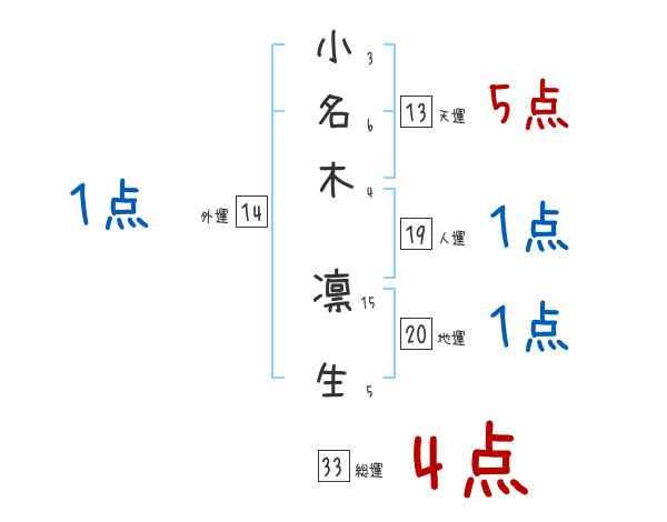 外運![]() | 小名木凛生さんの外運は14画の1つ星!人に対して優しいがストレスを溜め込みがち。人間関係のトラブルを避けるよう気をつけましょう。 生活面を象徴する運勢です。外部から受ける影響力を表し、結婚運、家庭運や職場、環境への順応性を表します。 |