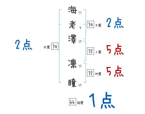人運![]() | 海老澤凛瞳さんの人運は32画の5つ星!柔軟性があり成功する。チャンスが多く金運が良い。 性格や才能などを表す2番目に重要な運勢です。人間関係や協調性、社会的な成功に影響します。主に20歳から50歳ぐらいまでの中年期の運勢を表します。 |