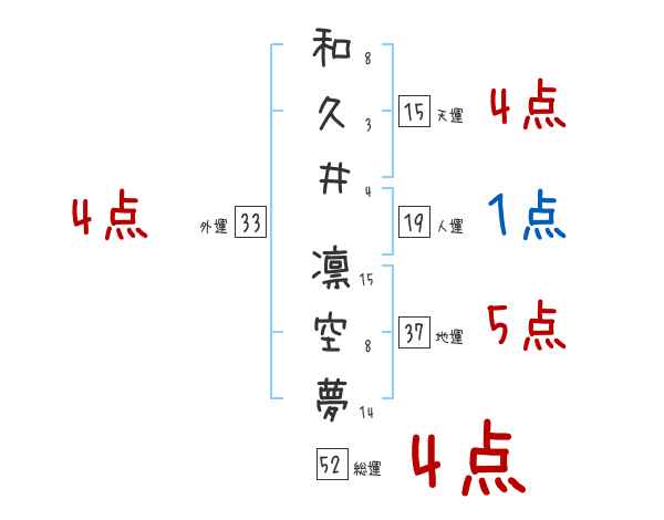 総運![]() | 和久井凛空夢さんの総運は52画の4つ星!先見性と独創性に優れ考える力がある。強運の持ち主。 あなたの人生を表す1番重要な運勢です。生涯を通じて影響する総合運となり、主に50歳以降の晩年期に影響を及ぼします。 |
