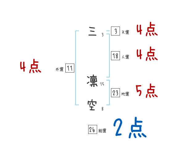 天運![]() | 三凛空さんの天運は3画の4つ星!活動的で才能に恵まれ、多くの信頼を得る。希望に満ち成長する。 家系が持つ宿命的な運勢を表します。祖先から受け継いだ苗字ですので自分の力が及びません。家柄を象徴します。 |