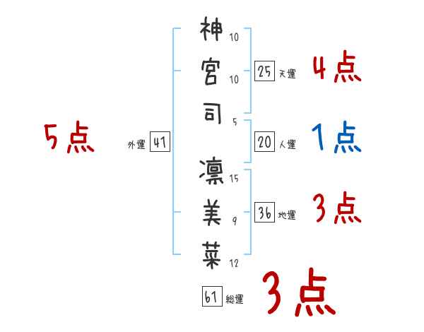 天運![]() | 神宮司凛美菜さんの天運は25画の4つ星!個性があり才能があふれる。強運の持ち主で発展する。 家系が持つ宿命的な運勢を表します。祖先から受け継いだ苗字ですので自分の力が及びません。家柄を象徴します。 |