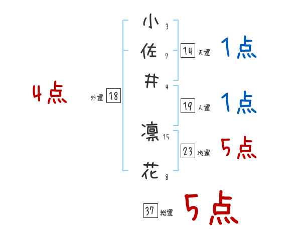外運![]() | 小佐井凛花さんの外運は18画の4つ星!情熱的で剛気。忍耐力があり信頼される。 生活面を象徴する運勢です。外部から受ける影響力を表し、結婚運、家庭運や職場、環境への順応性を表します。 |