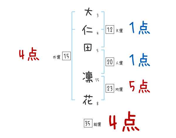 外運![]() | 大仁田凛花さんの外運は15画の4つ星!人徳があり出世する。順調に物事を進め円満な人生。 生活面を象徴する運勢です。外部から受ける影響力を表し、結婚運、家庭運や職場、環境への順応性を表します。 |