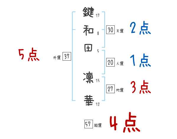 総運![]() | 鍵和田凛華さんの総運は57画の4つ星!向上心があり人望がある。地位を得る。 あなたの人生を表す1番重要な運勢です。生涯を通じて影響する総合運となり、主に50歳以降の晩年期に影響を及ぼします。 |