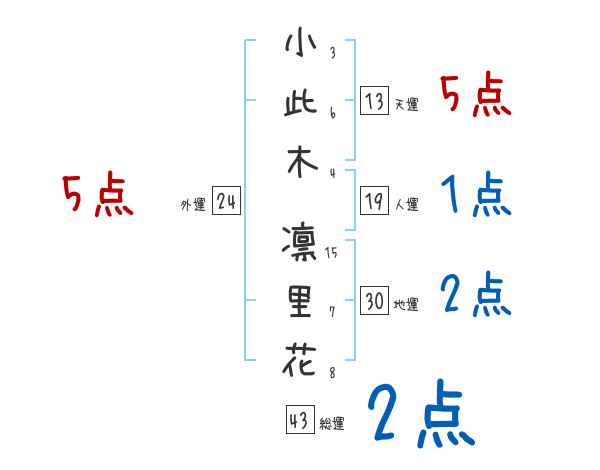 総運![]() | 小此木凛里花さんの総運は43画の2つ星!頑固な性格で独立心が強いかも。やや非現実的で浪費に注意しましょう。 あなたの人生を表す1番重要な運勢です。生涯を通じて影響する総合運となり、主に50歳以降の晩年期に影響を及ぼします。 |