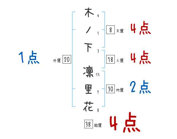 天運![]() | 木ノ下凛里花さんの天運は8画の4つ星!勤勉家。根気強く努力し成功する。忍耐力がある。 家系が持つ宿命的な運勢を表します。祖先から受け継いだ苗字ですので自分の力が及びません。家柄を象徴します。 |