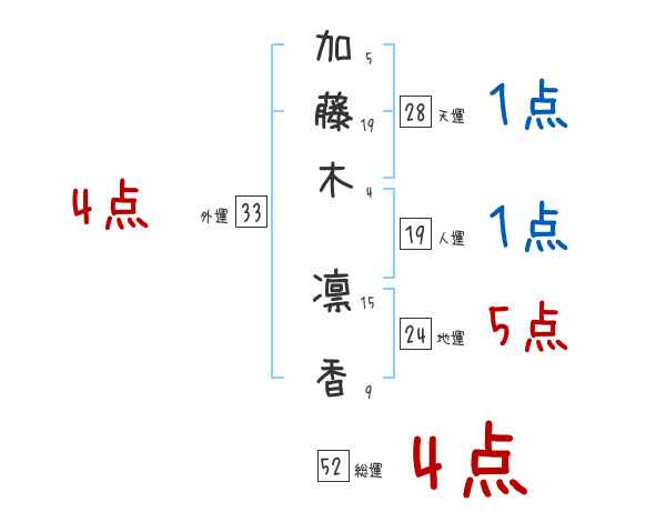 天運![]() | 加藤木凛香さんの天運は28画の1つ星!家庭環境に注意。スポーツで活躍できる能力があるかも。 家系が持つ宿命的な運勢を表します。祖先から受け継いだ苗字ですので自分の力が及びません。家柄を象徴します。 |