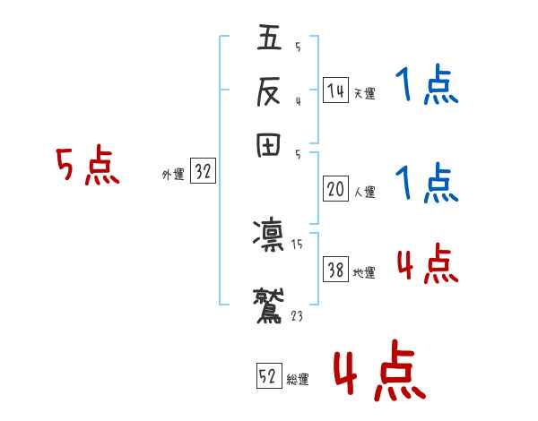 外運![]() | 五反田凛鷲さんの外運は32画の5つ星!柔軟性があり成功する。チャンスが多く金運が良い。 生活面を象徴する運勢です。外部から受ける影響力を表し、結婚運、家庭運や職場、環境への順応性を表します。 |
