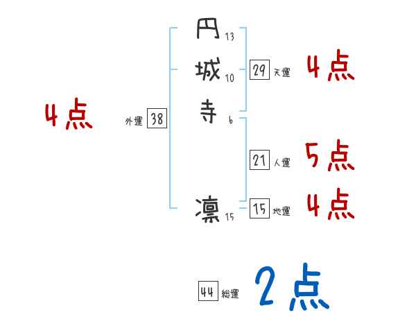 総運![]() | 円城寺凛さんの総運は44画の2つ星!誠実で慎重な性格。物事を考えすぎないように注意しましょう。 あなたの人生を表す1番重要な運勢です。生涯を通じて影響する総合運となり、主に50歳以降の晩年期に影響を及ぼします。 |
