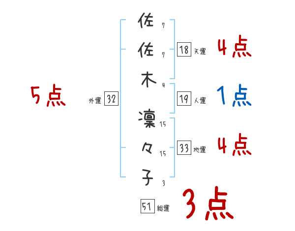 外運![]() | 佐佐木凜々子さんの外運は32画の5つ星!柔軟性があり成功する。チャンスが多く金運が良い。 生活面を象徴する運勢です。外部から受ける影響力を表し、結婚運、家庭運や職場、環境への順応性を表します。 |