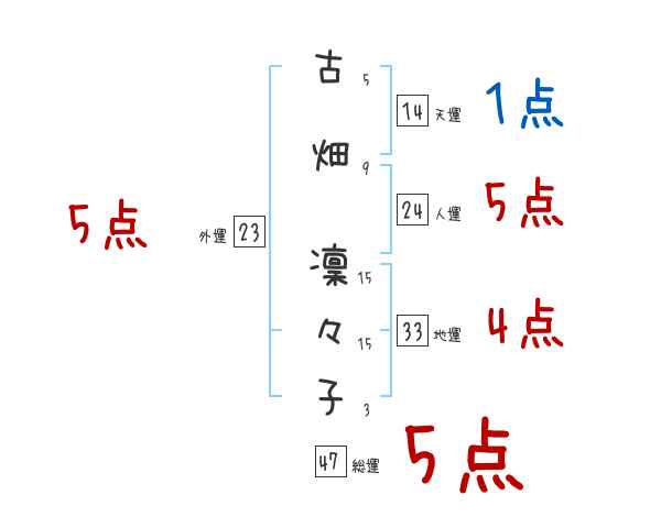 総運![]() | 古畑凜々子さんの総運は47画の5つ星!実力が開花し発展する円満な人生。財に恵まれる。 あなたの人生を表す1番重要な運勢です。生涯を通じて影響する総合運となり、主に50歳以降の晩年期に影響を及ぼします。 |