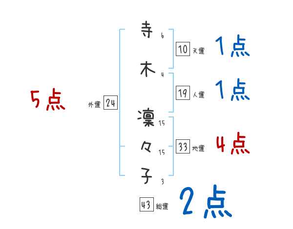 天運![]() | 寺木凜々子さんの天運は10画の1つ星!不安を感じやすい傾向。ストレスを抱えないように注意しましょう。 家系が持つ宿命的な運勢を表します。祖先から受け継いだ苗字ですので自分の力が及びません。家柄を象徴します。 |