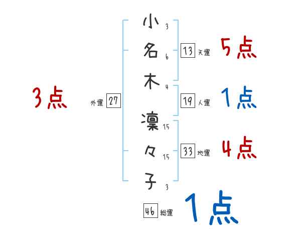総運![]() | 小名木凜々子さんの総運は46画の1つ星!迷走することが多く苦労するかも。目先のことにとらわれないように。 あなたの人生を表す1番重要な運勢です。生涯を通じて影響する総合運となり、主に50歳以降の晩年期に影響を及ぼします。 |
