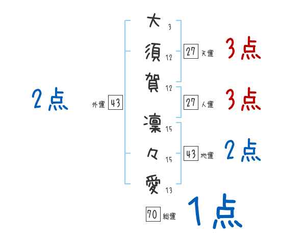 天運![]() | 大須賀凜々愛さんの天運は27画の3つ星!頭脳明晰だが強情で摩擦が多い傾向。孤立に注意。 家系が持つ宿命的な運勢を表します。祖先から受け継いだ苗字ですので自分の力が及びません。家柄を象徴します。 |