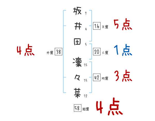 外運![]() | 坂井田凜々菜さんの外運は38画の4つ星!温厚な性格で技術的な才能を発揮する。職人的な仕事に向いている。 生活面を象徴する運勢です。外部から受ける影響力を表し、結婚運、家庭運や職場、環境への順応性を表します。 |
