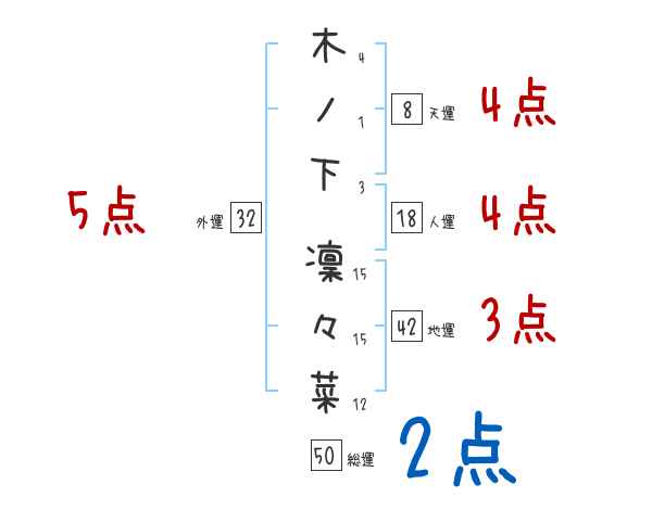 外運![]() | 木ノ下凜々菜さんの外運は32画の5つ星!柔軟性があり成功する。チャンスが多く金運が良い。 生活面を象徴する運勢です。外部から受ける影響力を表し、結婚運、家庭運や職場、環境への順応性を表します。 |