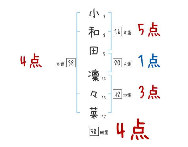 総運![]() | 小和田凜々菜さんの総運は58画の4つ星!安定した生活。大器晩成タイプ。 あなたの人生を表す1番重要な運勢です。生涯を通じて影響する総合運となり、主に50歳以降の晩年期に影響を及ぼします。 |