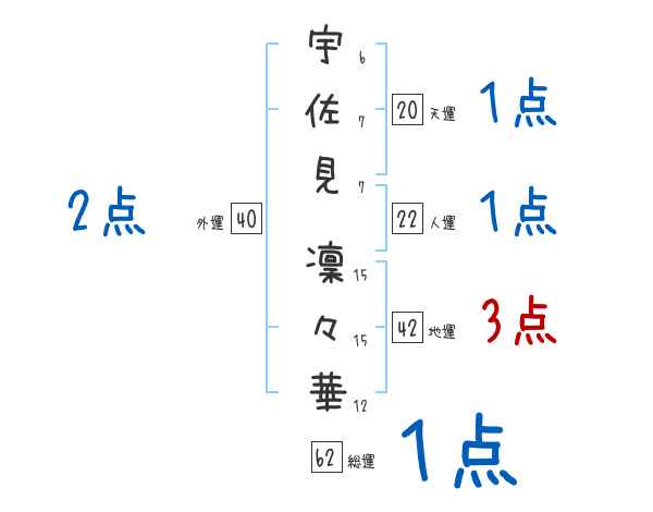 外運![]() | 宇佐見凜々華さんの外運は40画の2つ星!自信過剰で物事に固執するためトラブルに注意。 生活面を象徴する運勢です。外部から受ける影響力を表し、結婚運、家庭運や職場、環境への順応性を表します。 |