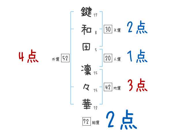 天運![]() | 鍵和田凜々華さんの天運は30画の2つ星!浮き沈みの激しさに注意しましょう。 家系が持つ宿命的な運勢を表します。祖先から受け継いだ苗字ですので自分の力が及びません。家柄を象徴します。 |