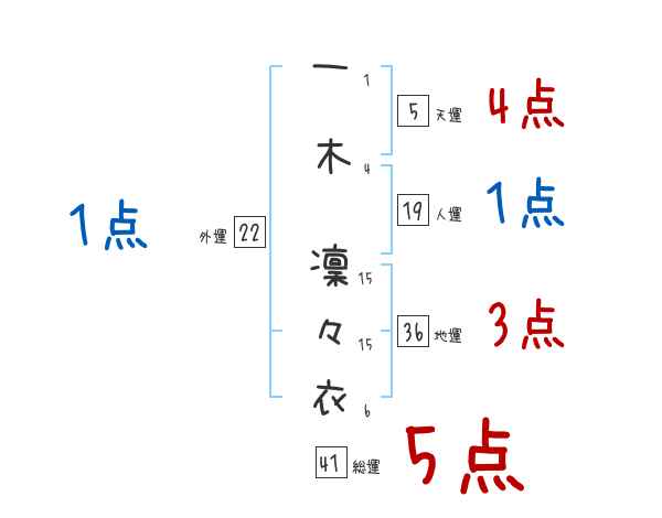 天運![]() | 一木凜々衣さんの天運は5画の4つ星!健康で安泰。協調性に優れ、財産に恵まれる。 家系が持つ宿命的な運勢を表します。祖先から受け継いだ苗字ですので自分の力が及びません。家柄を象徴します。 |