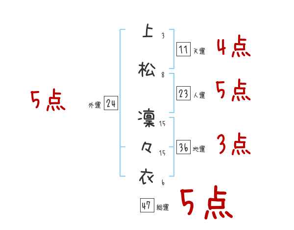 外運![]() | 上松凜々衣さんの外運は24画の5つ星!家庭運が良く順調な人生。金運にも恵まれる。 生活面を象徴する運勢です。外部から受ける影響力を表し、結婚運、家庭運や職場、環境への順応性を表します。 |