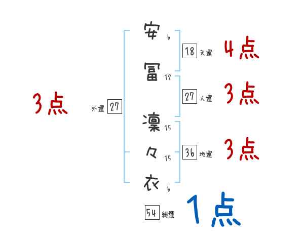 天運![]() | 安冨凜々衣さんの天運は18画の4つ星!情熱的で剛気。忍耐力があり信頼される。 家系が持つ宿命的な運勢を表します。祖先から受け継いだ苗字ですので自分の力が及びません。家柄を象徴します。 |