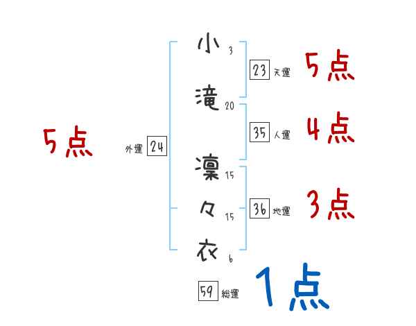 天運![]() | 小滝凜々衣さんの天運は23画の5つ星!想像力に優れ活力がある。一代で成功し名誉を手に入れる。 家系が持つ宿命的な運勢を表します。祖先から受け継いだ苗字ですので自分の力が及びません。家柄を象徴します。 |