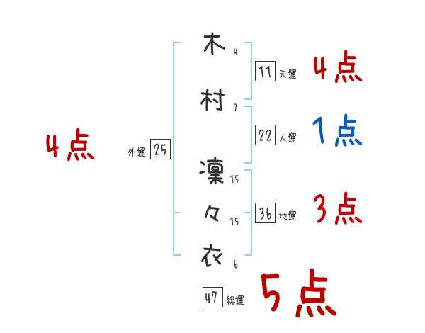 総運![]() | 木村凜々衣さんの総運は47画の5つ星!実力が開花し発展する円満な人生。財に恵まれる。 あなたの人生を表す1番重要な運勢です。生涯を通じて影響する総合運となり、主に50歳以降の晩年期に影響を及ぼします。 |