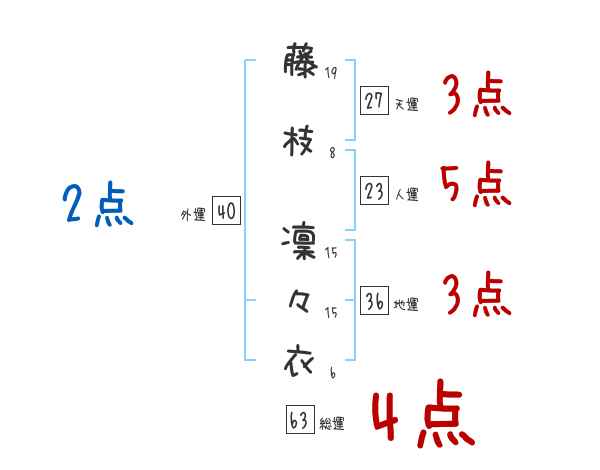 総運![]() | 藤枝凜々衣さんの総運は63画の4つ星!家庭運がよく順調な生活。温和な性格。 あなたの人生を表す1番重要な運勢です。生涯を通じて影響する総合運となり、主に50歳以降の晩年期に影響を及ぼします。 |