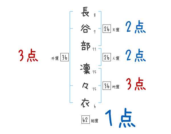 地運![]() | 長谷部凜々衣さんの地運は36画の3つ星!先見性が豊かです。多少神経質で苦労することも。 個性を表す基礎的な運勢です。性格形成や対人関係、行動力など家庭環境に影響されます。主に誕生してから20歳くらいまでの若年期の運勢を表します。 |