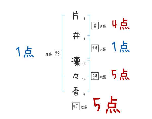 総運![]() | 片井凜々香さんの総運は47画の5つ星!実力が開花し発展する円満な人生。財に恵まれる。 あなたの人生を表す1番重要な運勢です。生涯を通じて影響する総合運となり、主に50歳以降の晩年期に影響を及ぼします。 |