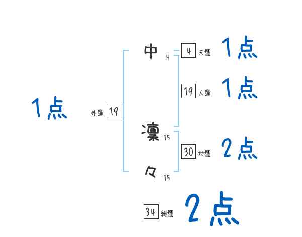 人運![]() | 中凜々さんの人運は19画の1つ星!優れた才能を持ちますが、協調性が足りないことも。周りの人と協力する事を意識しましょう。 性格や才能などを表す2番目に重要な運勢です。人間関係や協調性、社会的な成功に影響します。主に20歳から50歳ぐらいまでの中年期の運勢を表します。 |