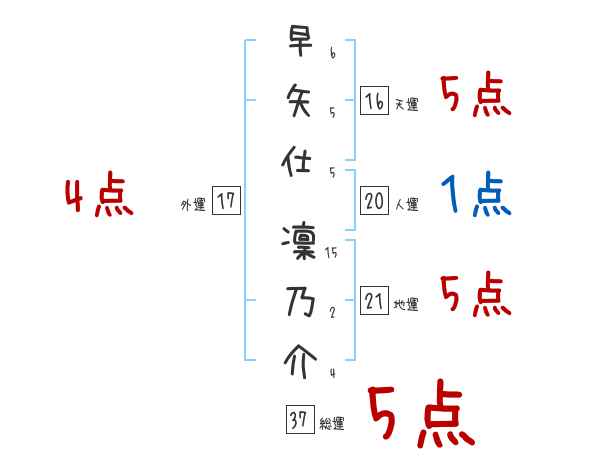 外運![]() | 早矢仕凜乃介さんの外運は17画の4つ星!積極的な行動力。地位を気づき財産を手に入れる。純粋な心と直感力。 生活面を象徴する運勢です。外部から受ける影響力を表し、結婚運、家庭運や職場、環境への順応性を表します。 |