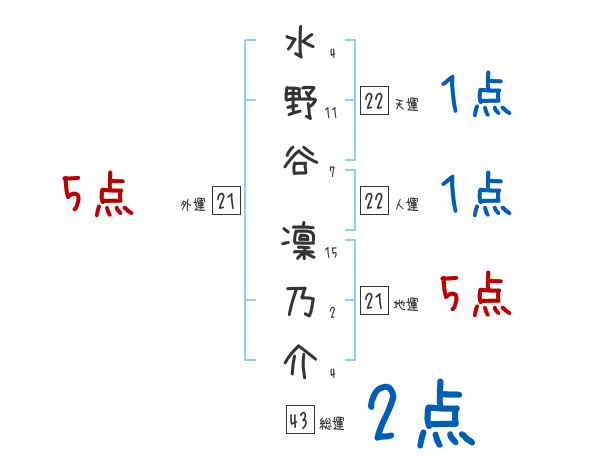 天運![]() | 水野谷凜乃介さんの天運は22画の1つ星!努力することが苦手ないっぽう手先が器用。芸術性にも優れる。 家系が持つ宿命的な運勢を表します。祖先から受け継いだ苗字ですので自分の力が及びません。家柄を象徴します。 |