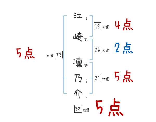 総運![]() | 江崎凜乃介さんの総運は39画の5つ星!社交性に優れ人望が厚い。人の上に立ち成功する。 あなたの人生を表す1番重要な運勢です。生涯を通じて影響する総合運となり、主に50歳以降の晩年期に影響を及ぼします。 |