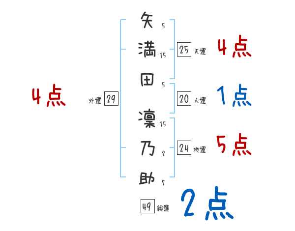 天運![]() | 矢満田凜乃助さんの天運は25画の4つ星!個性があり才能があふれる。強運の持ち主で発展する。 家系が持つ宿命的な運勢を表します。祖先から受け継いだ苗字ですので自分の力が及びません。家柄を象徴します。 |