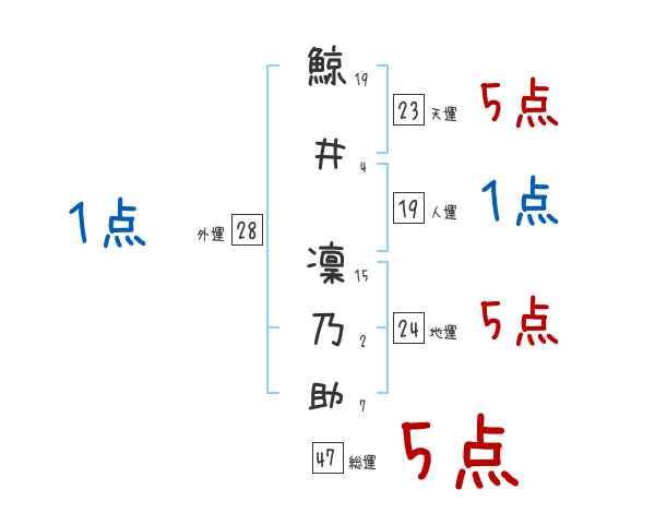 天運![]() | 鯨井凜乃助さんの天運は23画の5つ星!想像力に優れ活力がある。一代で成功し名誉を手に入れる。 家系が持つ宿命的な運勢を表します。祖先から受け継いだ苗字ですので自分の力が及びません。家柄を象徴します。 |