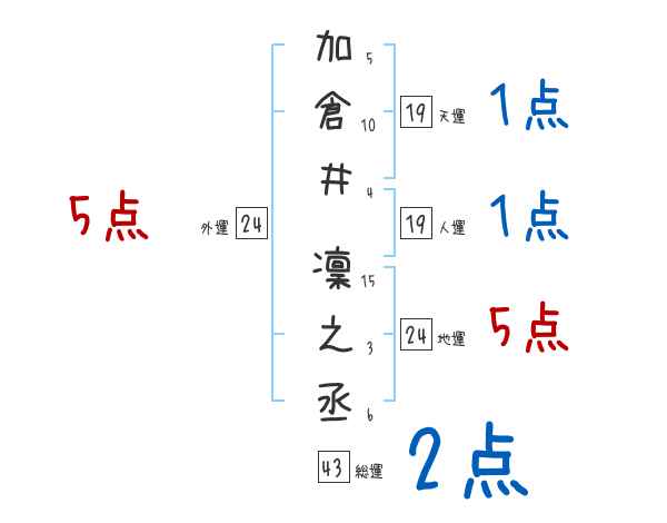 外運![]() | 加倉井凜之丞さんの外運は24画の5つ星!家庭運が良く順調な人生。金運にも恵まれる。 生活面を象徴する運勢です。外部から受ける影響力を表し、結婚運、家庭運や職場、環境への順応性を表します。 |