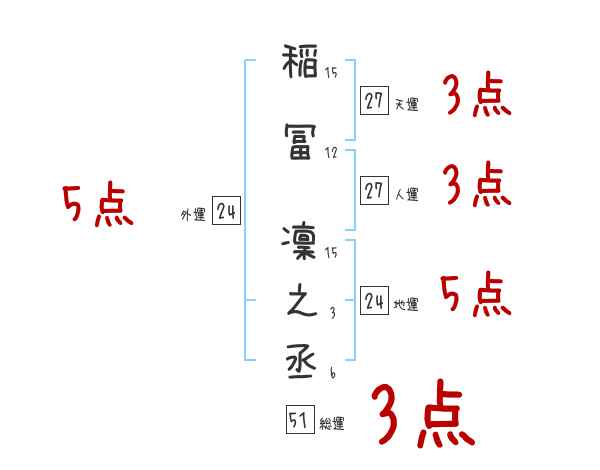 天運![]() | 稲冨凜之丞さんの天運は27画の3つ星!頭脳明晰だが強情で摩擦が多い傾向。孤立に注意。 家系が持つ宿命的な運勢を表します。祖先から受け継いだ苗字ですので自分の力が及びません。家柄を象徴します。 |