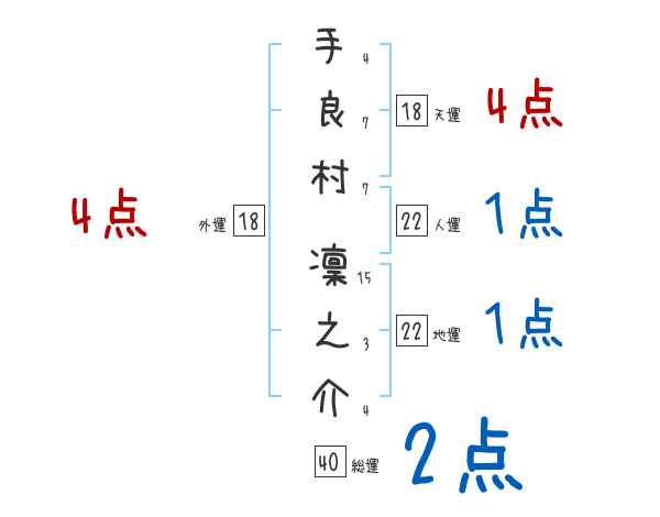 天運![]() | 手良村凜之介さんの天運は18画の4つ星!情熱的で剛気。忍耐力があり信頼される。 家系が持つ宿命的な運勢を表します。祖先から受け継いだ苗字ですので自分の力が及びません。家柄を象徴します。 |