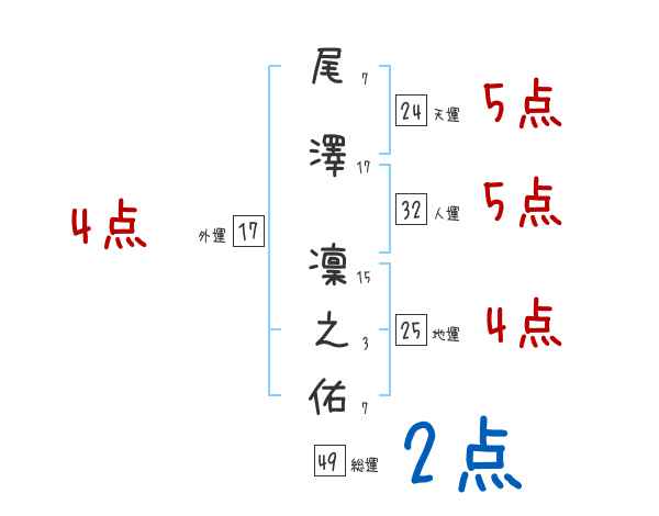 天運![]() | 尾澤凜之佑さんの天運は24画の5つ星!家庭運が良く順調な人生。金運にも恵まれる。 家系が持つ宿命的な運勢を表します。祖先から受け継いだ苗字ですので自分の力が及びません。家柄を象徴します。 |