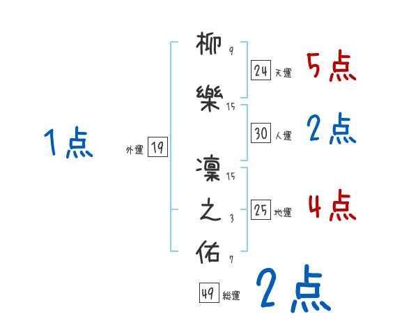 天運![]() | 柳樂凜之佑さんの天運は24画の5つ星!家庭運が良く順調な人生。金運にも恵まれる。 家系が持つ宿命的な運勢を表します。祖先から受け継いだ苗字ですので自分の力が及びません。家柄を象徴します。 |