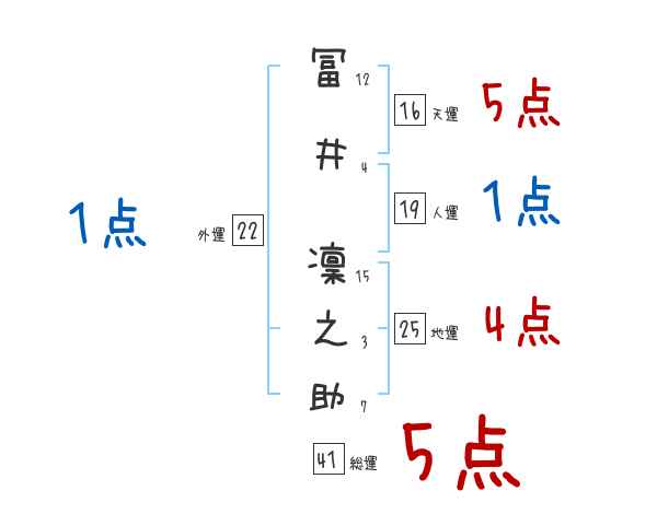 外運![]() | 冨井凜之助さんの外運は22画の1つ星!努力することが苦手ないっぽう手先が器用。芸術性にも優れる。 生活面を象徴する運勢です。外部から受ける影響力を表し、結婚運、家庭運や職場、環境への順応性を表します。 |