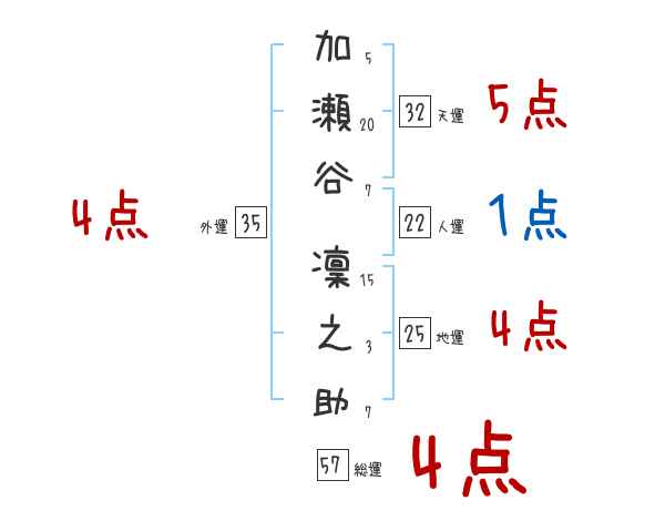 外運![]() | 加瀬谷凜之助さんの外運は35画の4つ星!温厚な性格で感受性が高い。穏和な性格で人望が厚い。 生活面を象徴する運勢です。外部から受ける影響力を表し、結婚運、家庭運や職場、環境への順応性を表します。 |