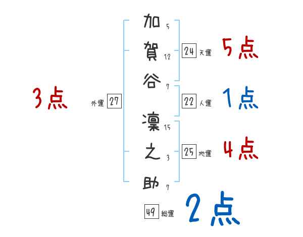 天運![]() | 加賀谷凜之助さんの天運は24画の5つ星!家庭運が良く順調な人生。金運にも恵まれる。 家系が持つ宿命的な運勢を表します。祖先から受け継いだ苗字ですので自分の力が及びません。家柄を象徴します。 |