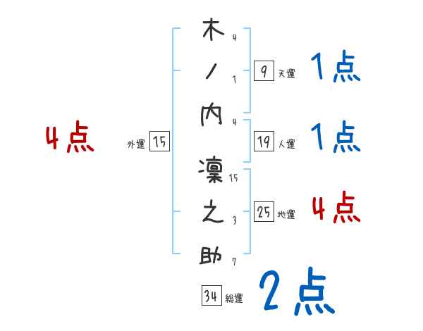 外運![]() | 木ノ内凜之助さんの外運は15画の4つ星!人徳があり出世する。順調に物事を進め円満な人生。 生活面を象徴する運勢です。外部から受ける影響力を表し、結婚運、家庭運や職場、環境への順応性を表します。 |