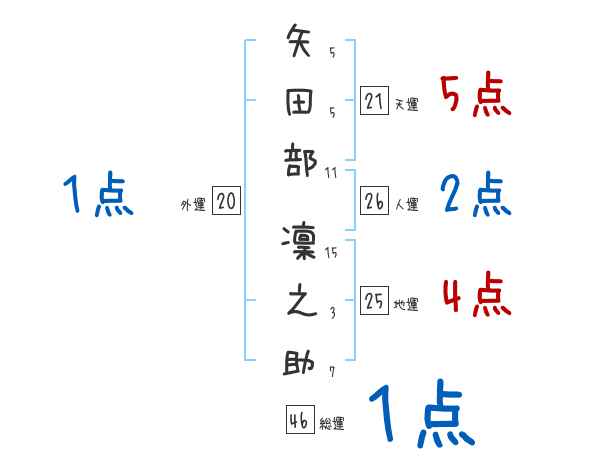 天運![]() | 矢田部凜之助さんの天運は21画の5つ星!統率力がある。独立し成功する。名誉を手に入れる。 家系が持つ宿命的な運勢を表します。祖先から受け継いだ苗字ですので自分の力が及びません。家柄を象徴します。 |
