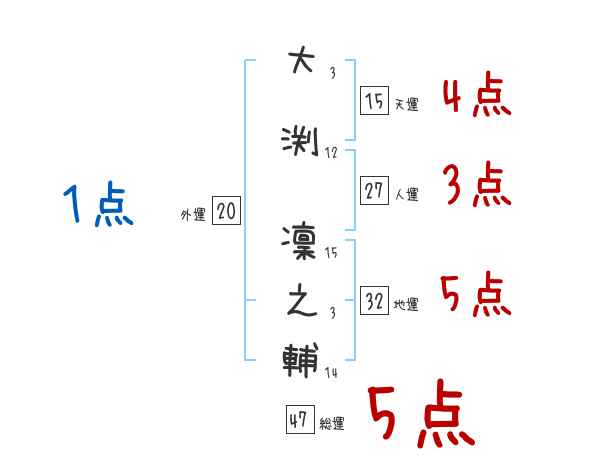 総運![]() | 大渕凜之輔さんの総運は47画の5つ星!実力が開花し発展する円満な人生。財に恵まれる。 あなたの人生を表す1番重要な運勢です。生涯を通じて影響する総合運となり、主に50歳以降の晩年期に影響を及ぼします。 |
