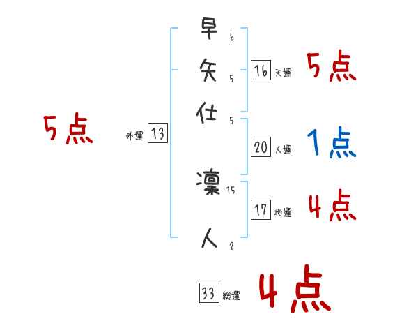 天運![]() | 早矢仕凜人さんの天運は16画の5つ星!人望が厚く大きく発展する。逆転成功が見える。 家系が持つ宿命的な運勢を表します。祖先から受け継いだ苗字ですので自分の力が及びません。家柄を象徴します。 |