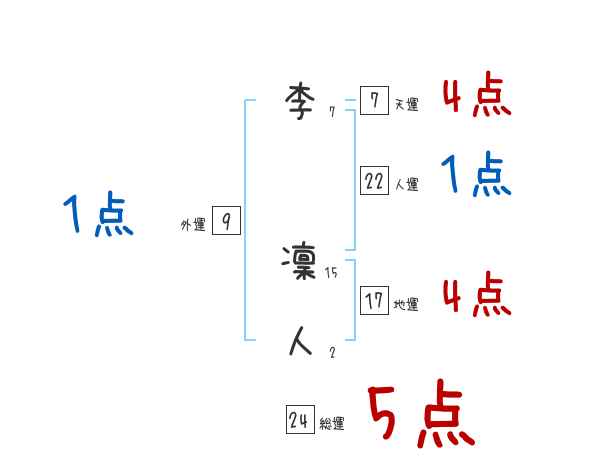 総運![]() | 李凜人さんの総運は24画の5つ星!家庭運が良く順調な人生。金運にも恵まれる。 あなたの人生を表す1番重要な運勢です。生涯を通じて影響する総合運となり、主に50歳以降の晩年期に影響を及ぼします。 |
